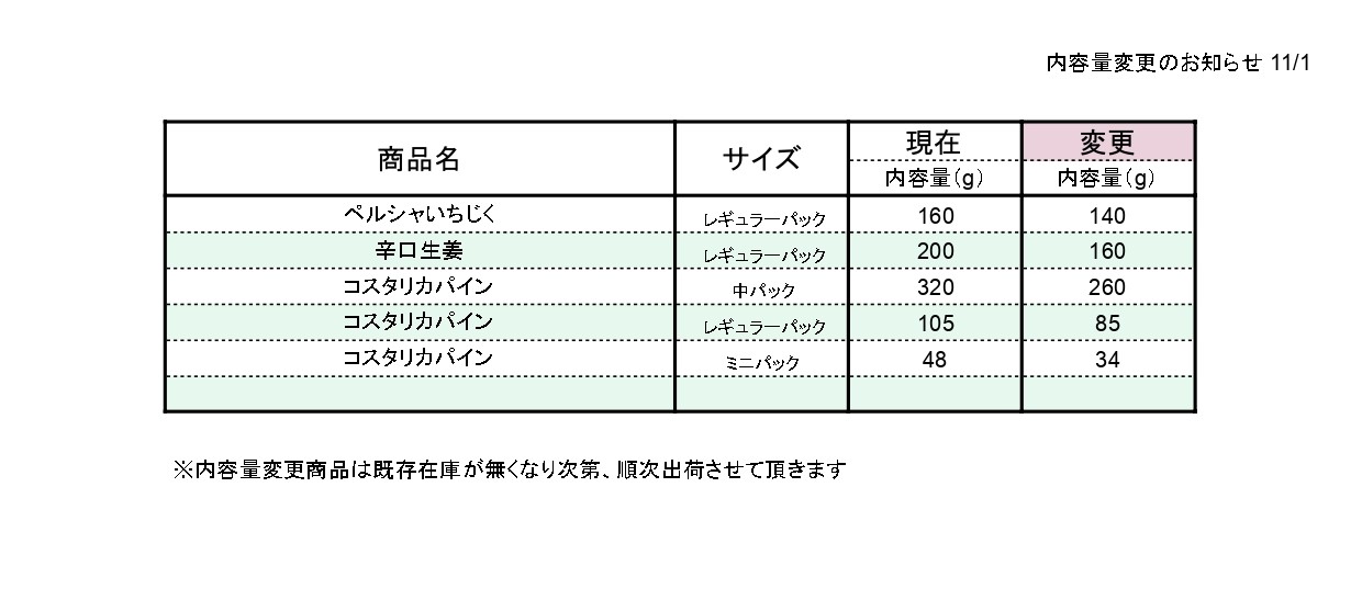 2025.10.20 すべて 一部商品内容量変更のお知らせ お客様各位 いつも当店をご利用頂き誠にありがとうございます。 原材料価格の高騰に伴い 2025年11月1日(土)受注分より 一部商品の内容量を調整させて頂きます。 お客様に多大なご迷惑をおかけ致しますが ご理解賜りますよう何卒宜しくお願い申し上げます。 内容量変更日 2025年11月1日